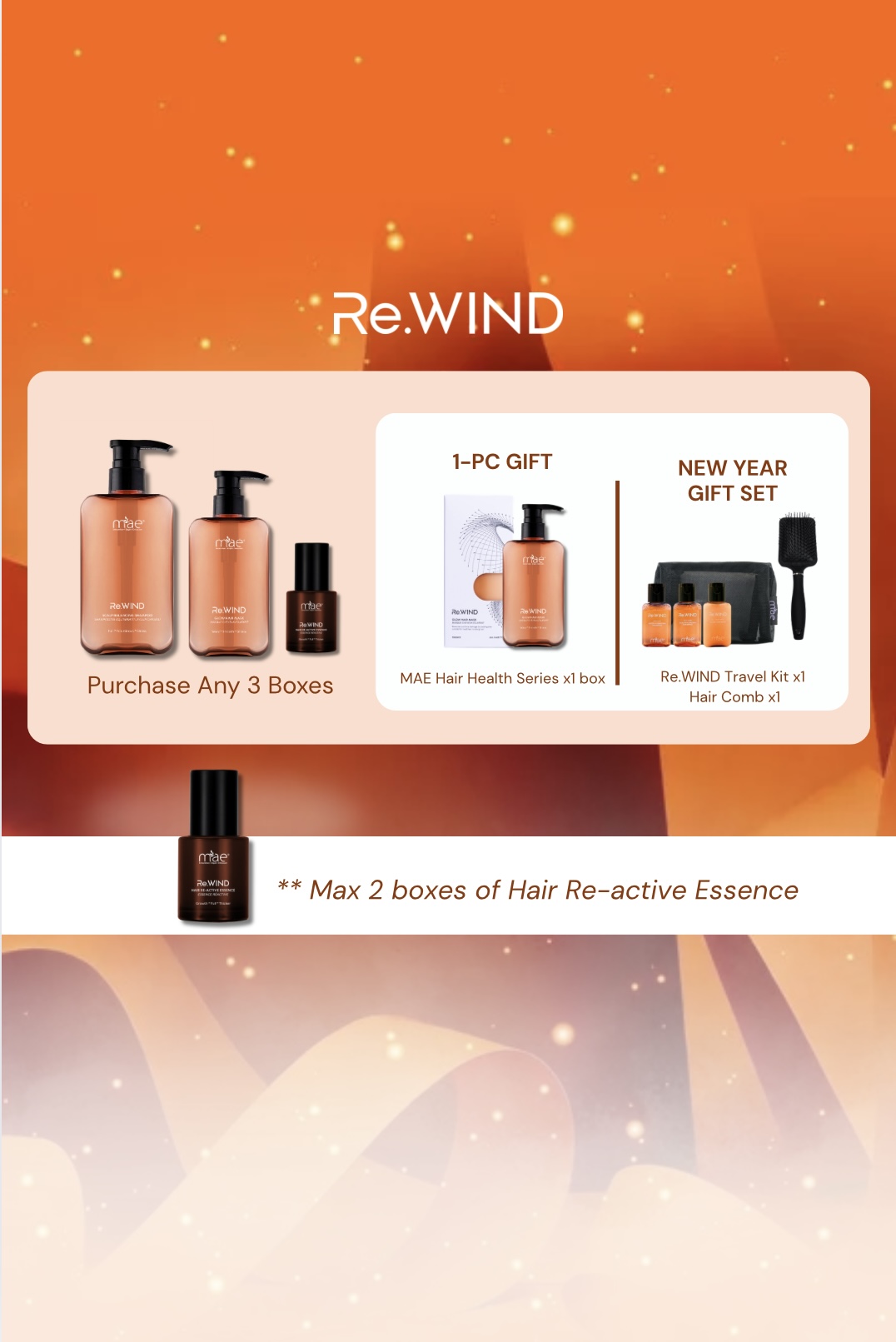 Purchase 3 boxes of MAE Hair Health Series to enjoy a VIP exclusive discount & get a 1-PC GIFT + NEW YEAR GIFT SET! 1-PC GIFT: - MAE Hair Health Series x1 box NEW YEAR GIFT SET: - Re.WIND Travel Kit x1 - Hair Comb x1 [RM288 x 3] - 21% = RM682 [BND114 x 3] - 27% = BND248 REMARKS: 1. 【2026 NEW YEAR PROMO】 is valid from 1/1/2026, 12PM - 20/1/2026, 11:59PM. 2. Purchasing this package will automatically upgrade to MAE VIP. 3. The purchase limit for Re.WIND Hair Re-active Essence is 2 boxes. 4. All packages and free gifts are available in limited quantities. First come, first served. While stocks last. 5. All package orders will be shipped within 3–7 working days, depending on order volume and processing sequence. 6. Our company reserves the right to make the final interpretation and amendments of the event rules.