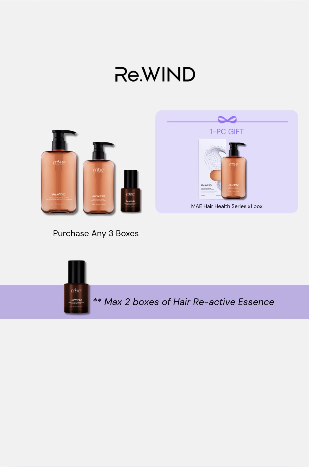 Purchase 3 boxes of MAE Hair Health Series to enjoy a VIP exclusive discount & get a 1-PC GIFT! 1-PC GIFT: - MAE Hair Health Series x1 box [RM288 x 3] - 21% = RM682 [BND114 x 3] - 27% = BND248 REMARKS: - Purchasing this package will automatically upgrade to MAE VIP. - The purchase limit for Re.WIND Hair Re-active Essence is 2 boxes.