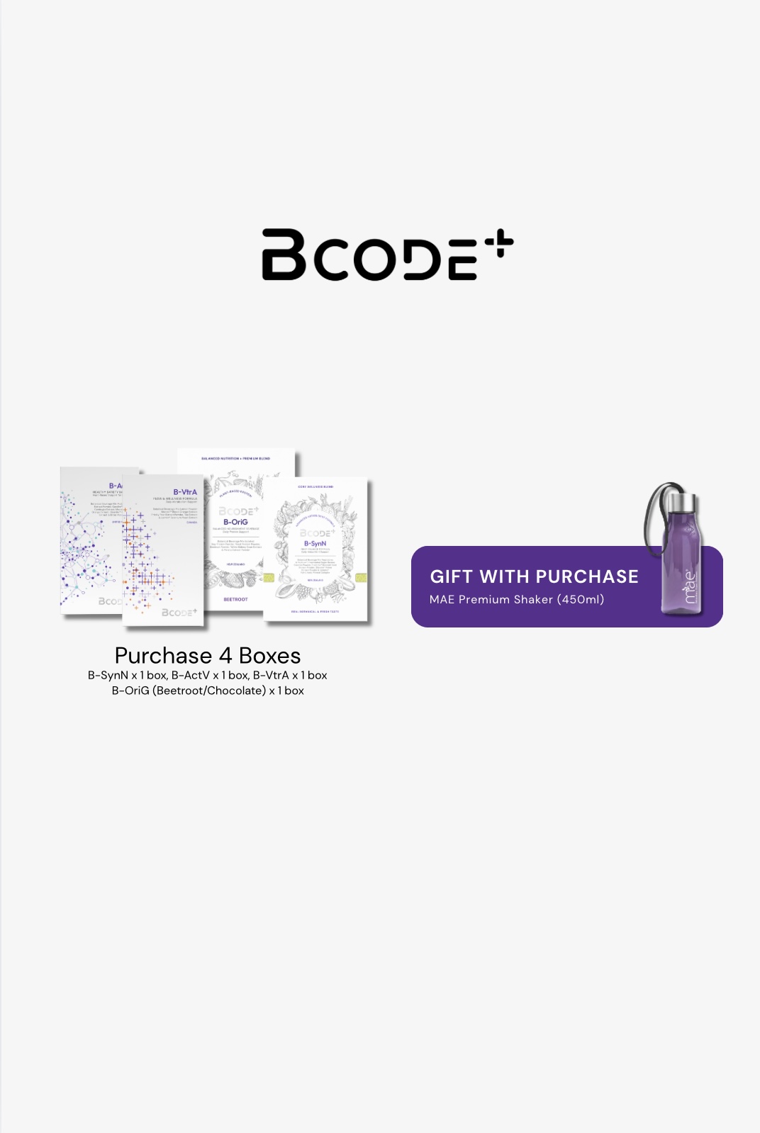 Purchase 4 boxes of BCODE+ to enjoy a VIP exclusive discount & get gift with purchase! The 4-box BCODE+ bundle includes: - B-SynN x 1 box - B-ActV x 1 box - B-VtrA x 1 box - B-OriG (Beetroot/Chocolate) x 1 box Gift with Purchase: - MAE Premium Shaker (450ml) VIP Price: RM1516 > RM1180 (-22%) SGD584 > SGD460 (-21%) BND612 > BND430 (-29%) HKD3412 > HKD2680 (-21%) Remarks: Purchasing this package will automatically upgrade to MAE VIP.