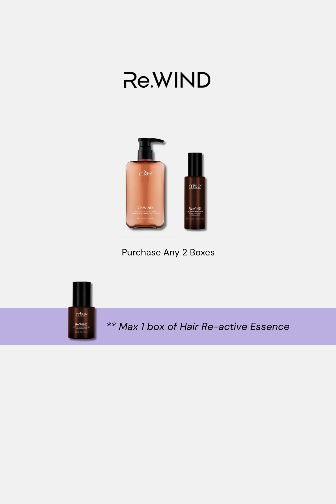 Purchase any 2 boxes of MAE Hair Health Series to enjoy exclusive discount for VIP & Members! VIP PRICE: [RM288 x 2] - 32% = RM390 [BND114 x 2] - 37% = BND143 MEMBER PRICE: [RM288 x 2] - 27% = RM419 [BND114 x 2] - 33% = BND152 REMARKS: - The purchase limit for Re.WIND Hair Re-active Essence is 1 box.