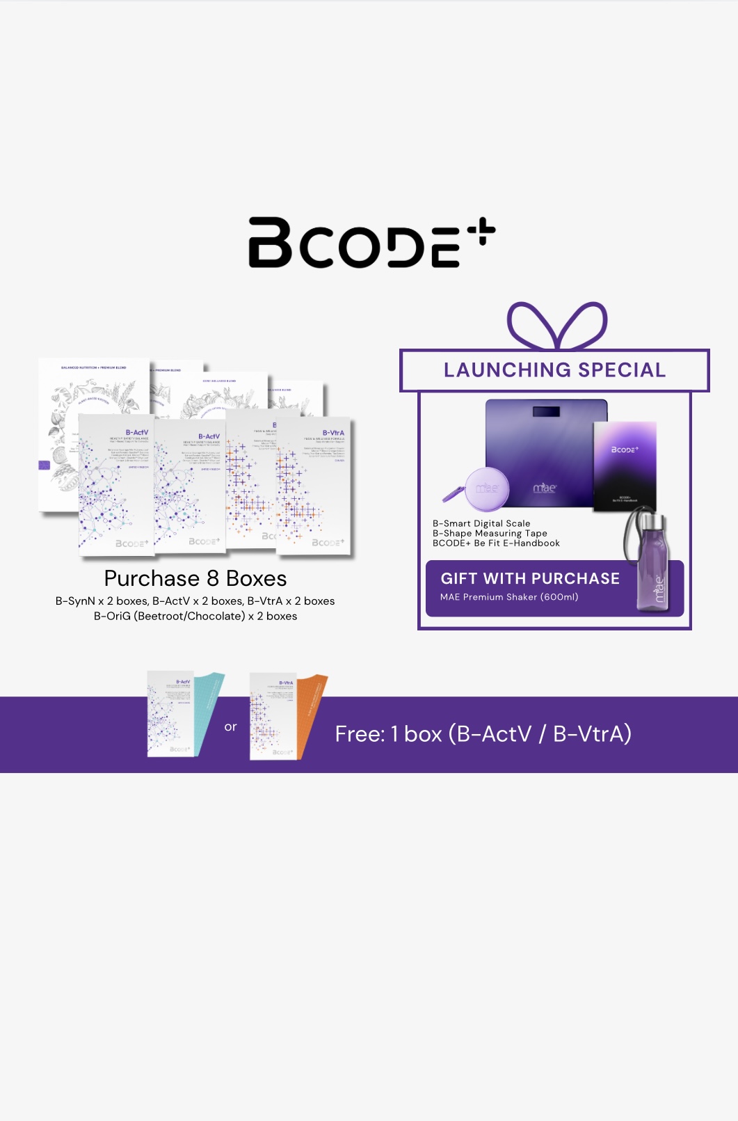 Purchase 8 boxes + free 1 box of BCODE+ to enjoy a VIP exclusive discount & get gift with purchase + launching special gift! The 8-box BCODE+ bundle includes: - B-SynN x 2 boxes - B-ActV x 2 boxes - B-VtrA x 2 boxes - B-OriG x 2 boxes Free: 1 Box (B-ActV / B-VtrA) Launching Special: - B-Smart DigitalScale - B-Shape Measuring Tape - BCODE+ Be Fit E-Handbook Gift with Purchase: - MAE Premium Bottle (600ml) RM3411 > RM2080 (-39%) SGD1314 > SGD810 (-38%) BND1377 > BND720 (-47%) HKD7677 > HKD4720 (-38%) Remarks: Purchasing this package will automatically upgrade to MAE VIP.