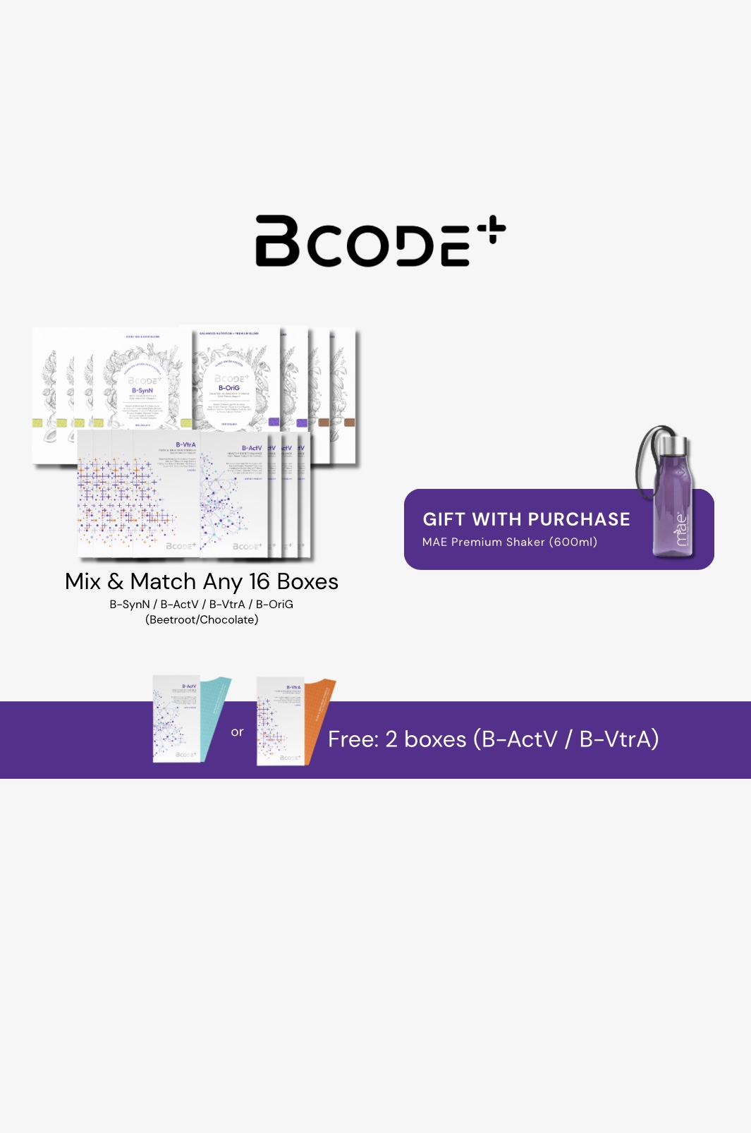 Mix & Match Any 16 Boxes + free 2 Boxes of BCODE+ to enjoy a VIP exclusive discount & get gift with purchase! Free: 2 Boxes (B-ActV / B-VtrA) Gift with Purchase: - MAE Premium Bottle (600ml) RM6822 > RM3880 (-43%) SGD2628 > SGD1510 (-42%) BND2754 > BND1360 (-50%) HKD15354 > HKD8810 (-42%) Remarks: * Free upgrade to SE Acc (T&C Apply) * Purchasing this package will automatically upgrade to MAE VIP